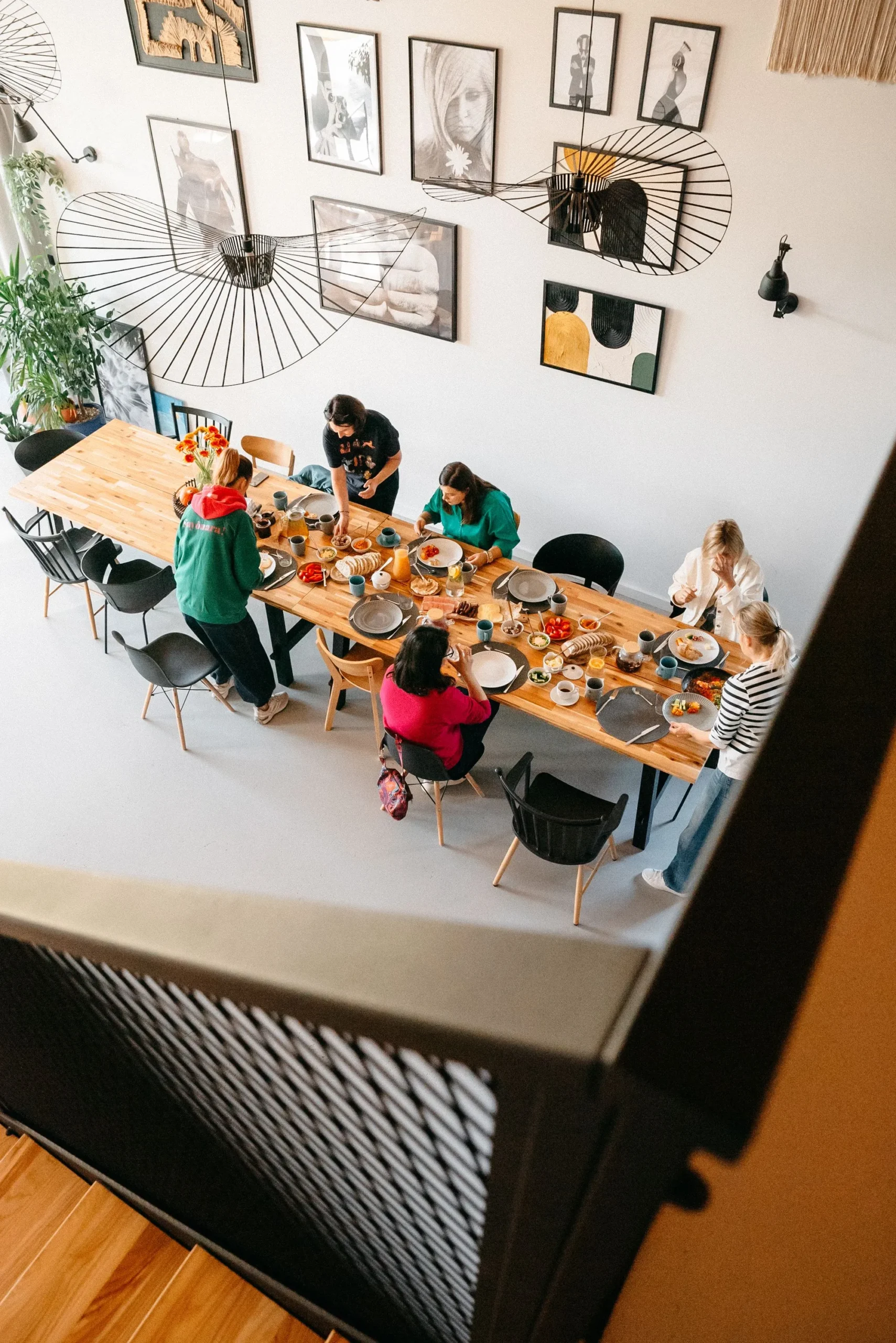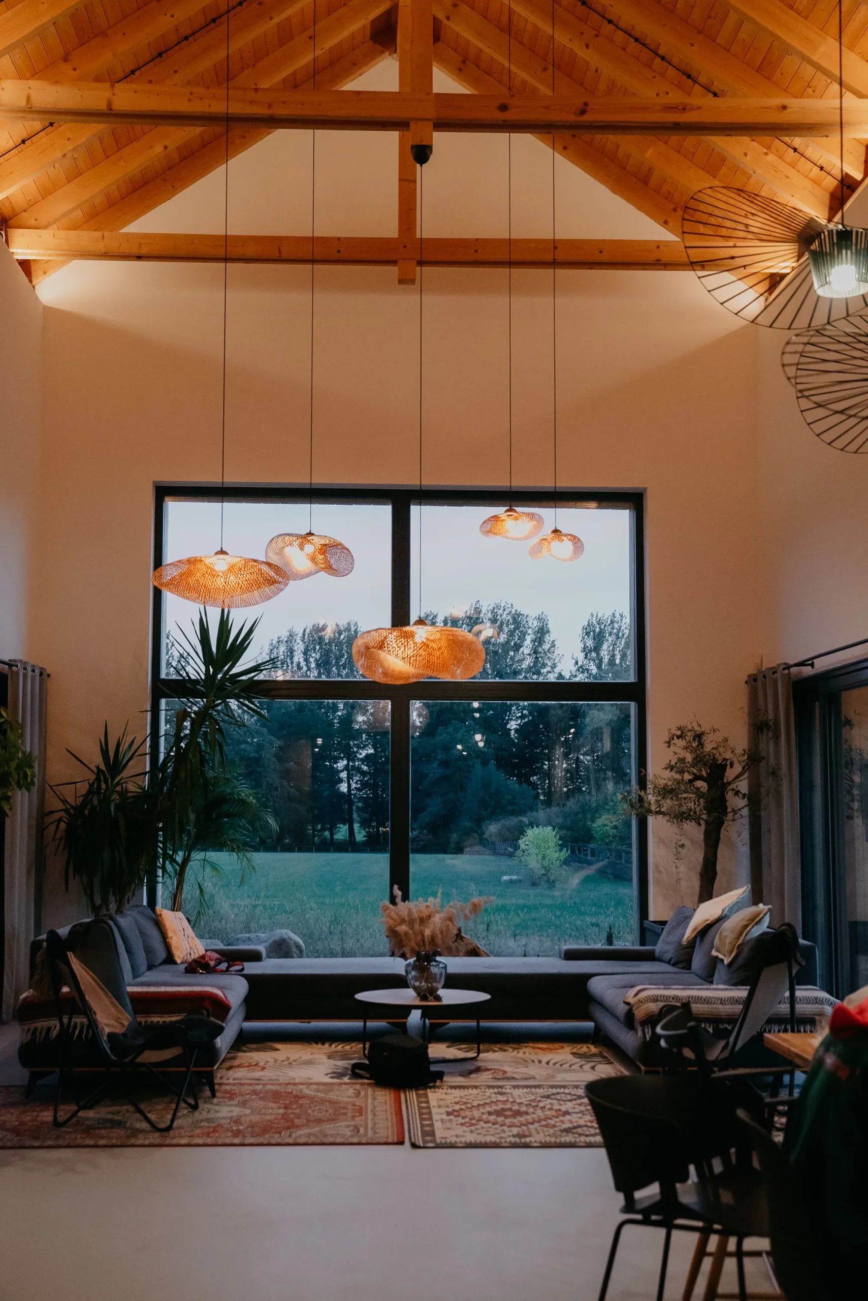 To tutaj przy dużym stole zasiadają grupy, by dzielić się posiłkami, rozmową i śmiechem. Obok, w wygodnych sofach przy ogromnym oknie, można zanurzyć się w widok łąki, która zdaje się wchodzić do środka. Latem otwarte tarasowe drzwi sprawiają, że natura staje się częścią wnętrza.